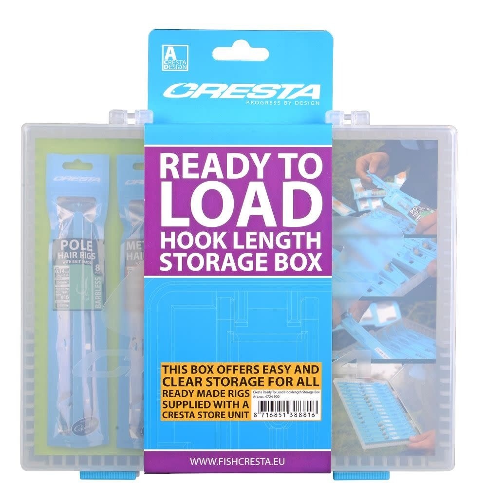 De Ready to Load Hooklength Storage Box is de ideale opbergplaats voor de kant en klare Cresta onderlijnen die op de Store Units geleverd worden. Haal de unit met daarop de zorgvuldig geknoopte onderlijnen uit de luchtdichte verpakking en plaats deze vervolgens in de Storage Box. De diverse Units kunnen bij gelijke lengte naast elkaar in de Storage box veilig opgeborgen worden. Hierdoor is het mogelijk allerlei soorten onderlijnen compact en overzichtelijk binnen handbereik te hebben.