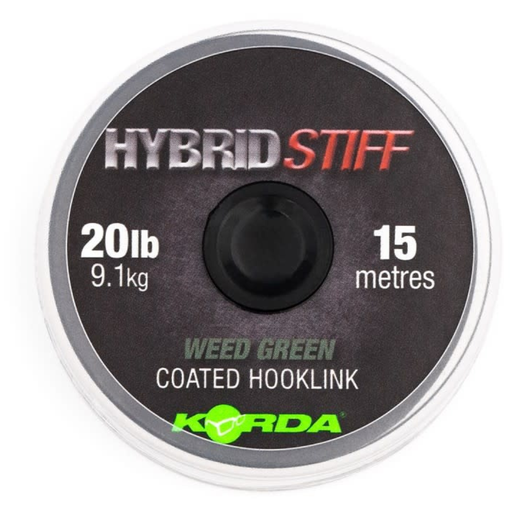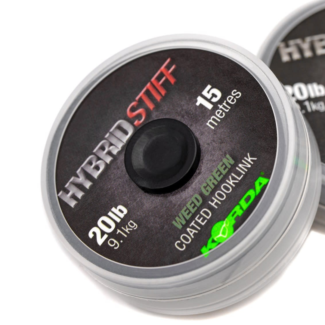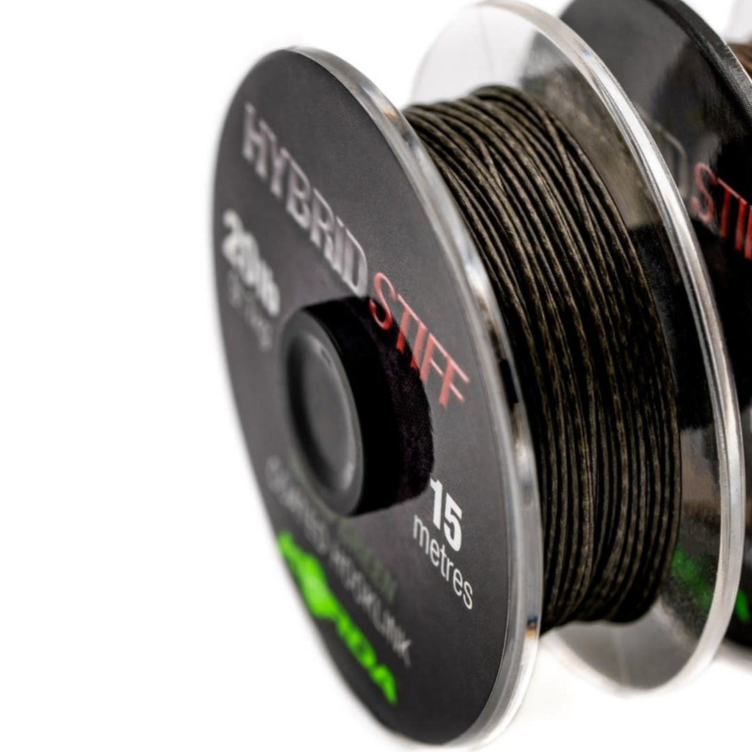 Hybrid Stiff gecoate onderlijn kan worden gebruikt met allerlei verschillende montages en biedt een onderlijnmateriaal dat erg stijf is door de coating die erop zit, maar dat een zeer soepele binnenste gevlochten kern heeft die blootgesteld wordt door de coating te verwijderen. Dit maakt het ideaal voor het eenvoudig creeren van elk type opstelling dat een soort combi-rig is, met stijve en soepele secties. De coating is zeer stevig en kan worden geknoopt - of zelfs gekrompen - zonder dat er breuken ontstaan en ongewenste scharnierpunten worden gecreeerd, maar kan ook gemakkelijk worden gestript waar dat nodig is. Het heeft een hoge knoopsterkte en is zeer slijtvast, en kan volledig recht worden gestoomd, bijvoorbeeld als het wordt gebruikt om een uitschuifbare sectie te creeren. Het heeft een breeksterkte van 20lb en is verkrijgbaar in Weedy Green of Gravel Brown, op een spoel van 20m.