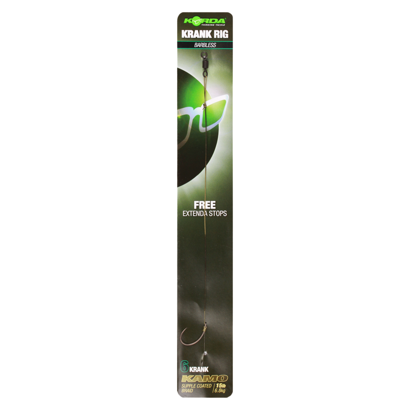 The Krank Ready Rig is een eenvoudige maar zeer effectieve kant-en-klare opstelling. Alles wat u hoeft te doen, is het uit de verpakking halen, het aan uw gekozen loodsysteem bevestigen, aas toevoegen en uitwerpen, met de wetenschap dat u een opstelling gebruikt met uitstekende inhaakeigenschappen die is geknoopt volgens strenge normen. Deze opstelling heeft onze Krank-haak in combinatie met Kamo-gecoate gevlochten lijn, met een breeksterkte die past bij de grootte van de gebruikte haak - 30lb voor maat 2; 20lb voor maat 4; en 15lb voor maten 6, 8 en 10. Elke onderlijn wordt geleverd met inbegrepen Extenda-bait stops, zodat de opstelling kan worden gebruikt met aas van elke grootte op dezelfde lengte hair. De onderlijnen zijn verkrijgbaar in zowel uitvoeringen met weerhaak als zonder weerhaak, met 1 per verpakking.