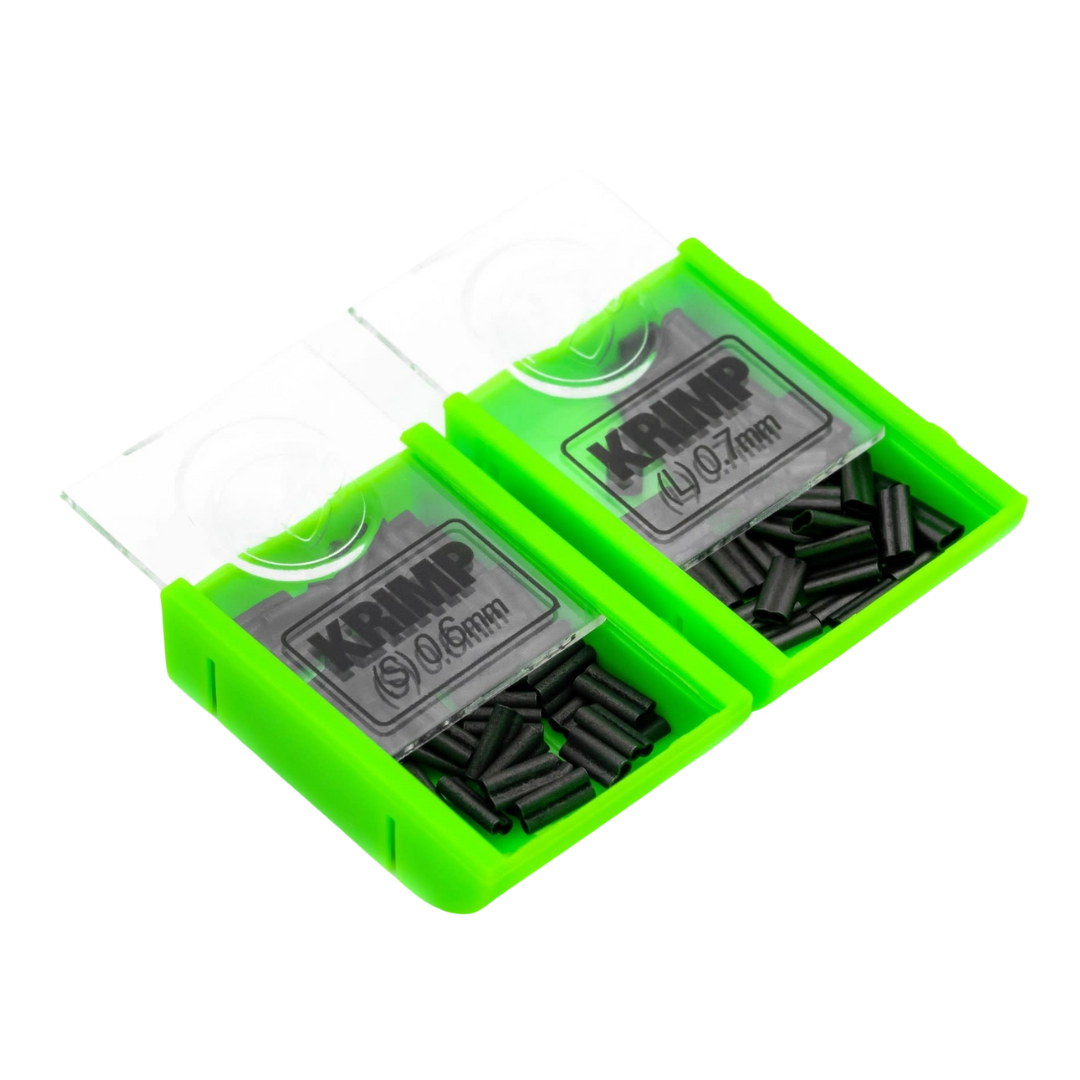 De Large 0.7mm Krimp is bedoeld voor zeer dikke materialen, zoals 35lb Boom of zeer zwaar monofilament. De nieuwste toevoeging aan het assortiment, de X-Small 0.5mm versie, is perfect voor gebruik met 15lb en 20lb Boom, of elk ander onderlijnmateriaal dat geschikt is voor krimpen (moet zeer weinig of geen rek hebben) en een diameter heeft tussen 0.40mm en 0.50mm. Ze worden geleverd in een handige doos met een schuifdeksel om morsen te voorkomen, met 50 Krimps in elke verpakking.