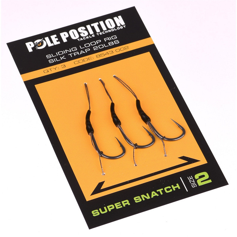 Dit is het ideale hulpmiddel om snel van haak te wisselen (door het gebruik van een lusverbinding) wanneer deze niet scherp genoeg meer is, waarbij het achterdeel/de Kick Back section van je rig hergebruikt kan worden. De uitermate scherpe, allround Pole Position Super Snatch haak in combinatie met een line aligner en sliding hair zorgen voor een zeer agressief prikkende rig die in vrijwel elke situatie ingezet kan worden. Zowel geschikt voor bodemaas aas als voor snowman presentaties.