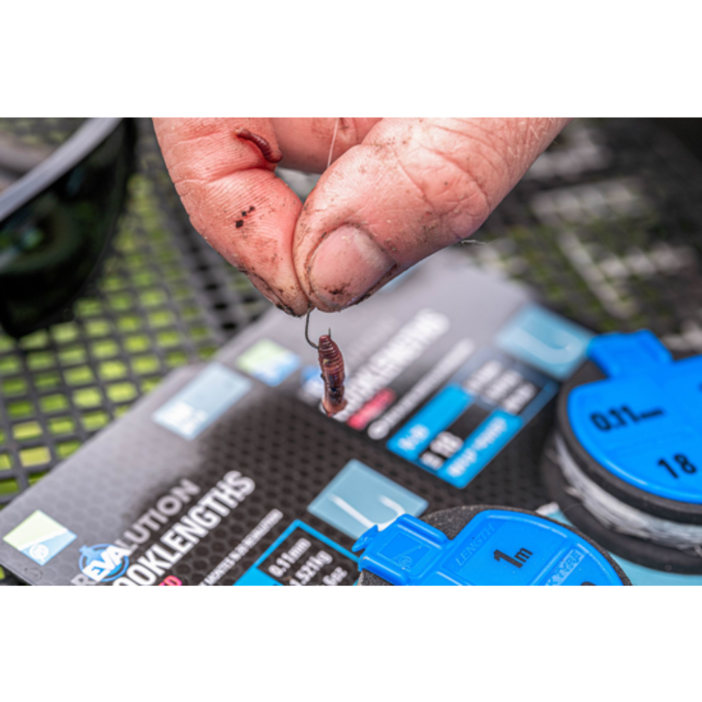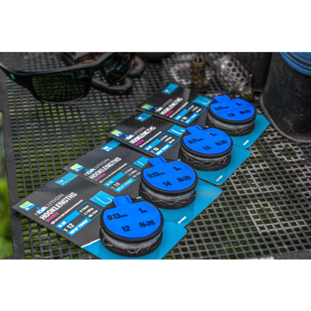 Een reeks hoogwaardige onderlijnen, speciaal ontworpen voor feedervissen. Elke spoel bevat 10 onderlijnen van 1 meter lang die eenvoudig kunnen worden afgewikkeld en aan de hoofdlijn bevestigd. De volgende onderlijn kan vervolgens worden vastgezet met behulp van de draaibare pin op de spoel, waardoor aparte pinnen overbodig zijn. Er zijn hoogwaardige Natural N Series haken gebruikt, geknoopt aan de beproefde Reflo Power lijn. De onderlijnen kunnen worden opgeborgen in het Revaluation opbergsysteem, perfect om al je onderlijnen geordend en beschermd tegen vocht en direct zonlicht te bewaren.