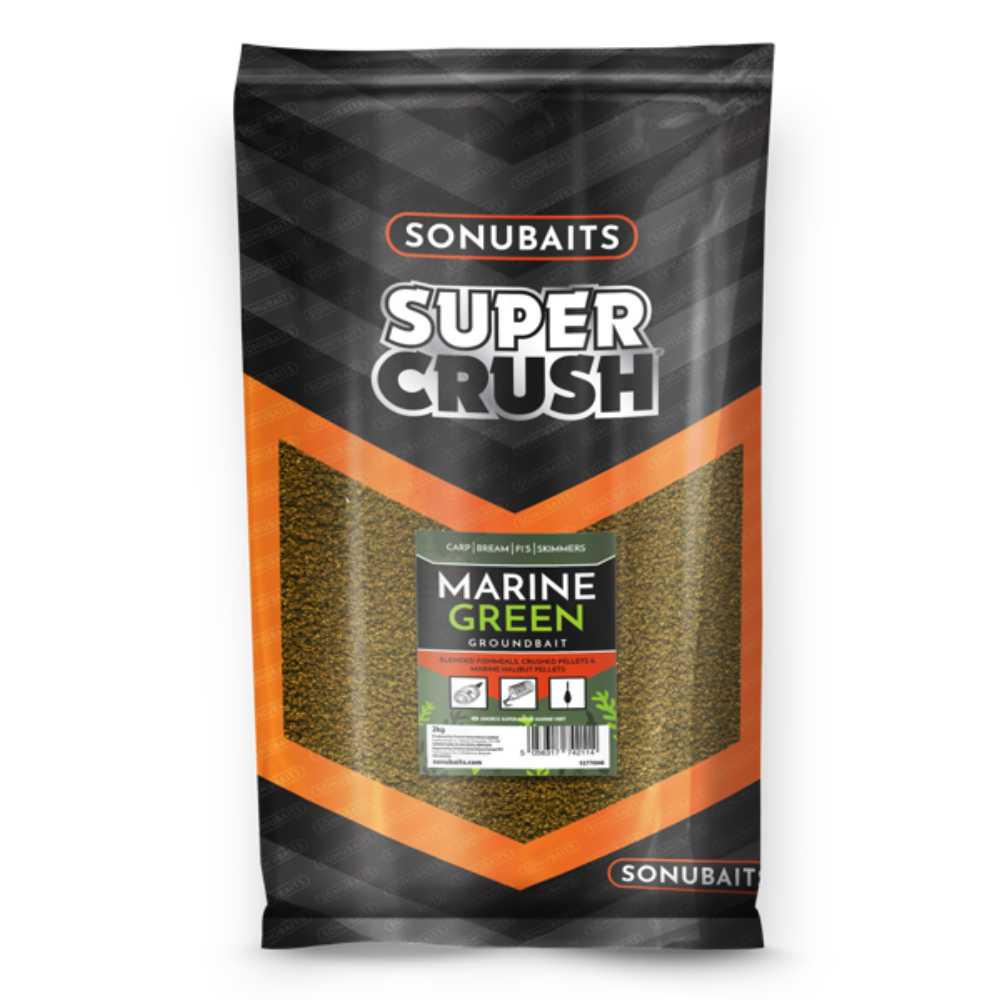 Marine Green maakt deel uit van ons toonaangevende 2 kg Supercrush-assortiment en is een ongelooflijk veelzijdige en zeer aantrekkelijke mix die Koi-, Witvis- en Zeeheilbotpellets combineert met krachtige vismeel en natuurlijke, gewilde voedselstimulatoren voor zeevis. Deze omvatten een aantrekkelijke vorm van zeealgen die een zoutige, visachtige smaak aan het lokvoer geven en tegelijkertijd de voedingswaarde bieden waar alle vissen actief naar op zoek zijn.
