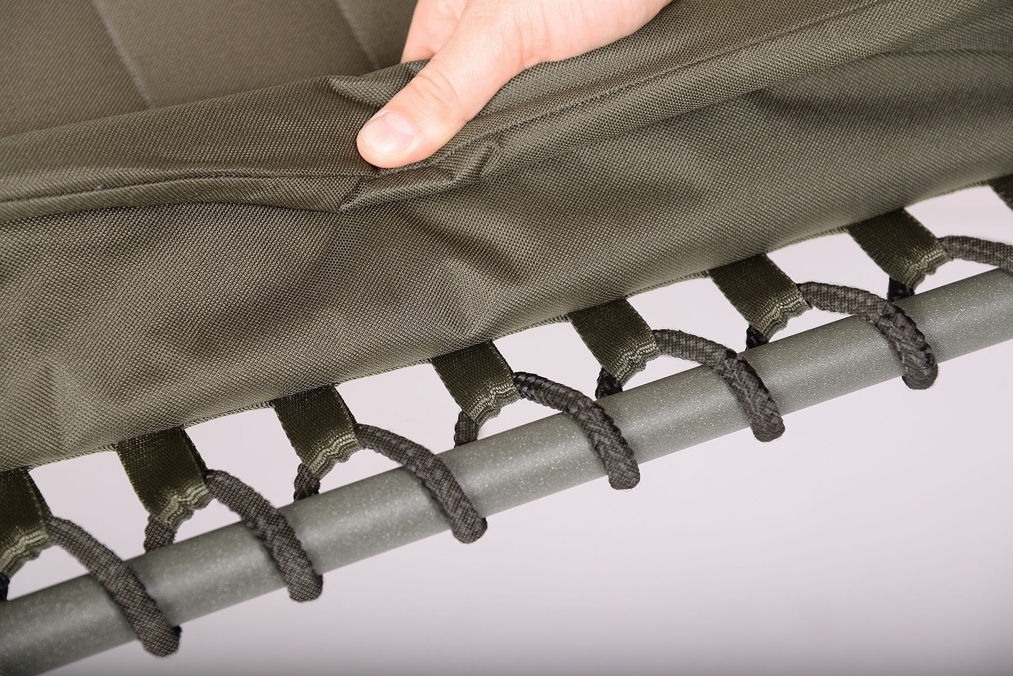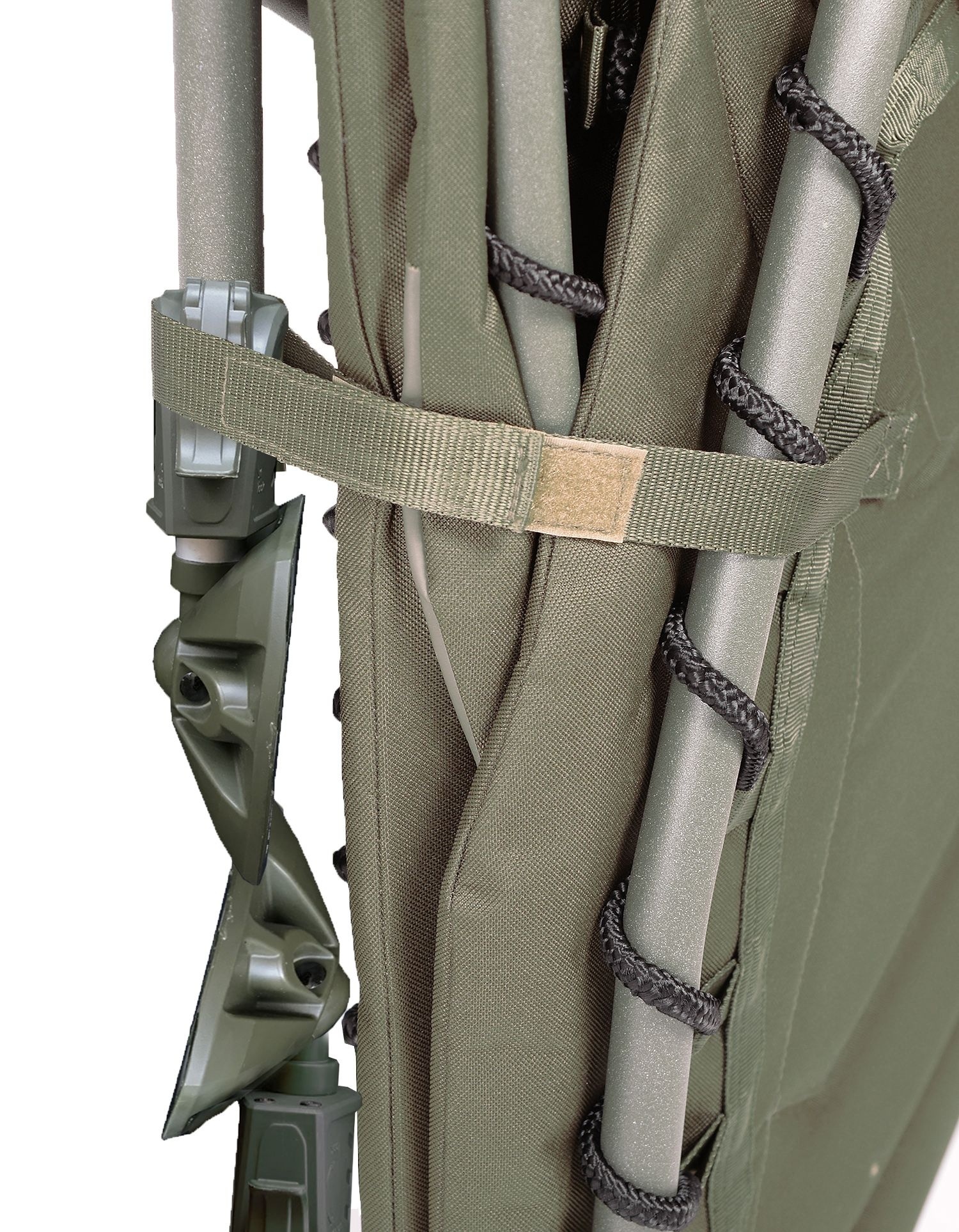 De High Flat Bedchair is ontworpen met een extra wijde 4-poot constructie. Dit maakt het bed stabieler ten opzichten van de 6-poots uitvoeringen. De poten klik je vast aan het frame om een stevig geheel te maken. De unieke extra ruimte tussen de poten biedt de mogelijkheid om een hoger slaappositie te realiseren wanneer gewenst. Het bed is tussen de 35-55 cm hoog! Het matras is bevestigd met een strak gespannen koord voor extra comfort en ondersteuning voor je rug. Afmeting: H 35-55cm/ L 210cm/ W 80cm.