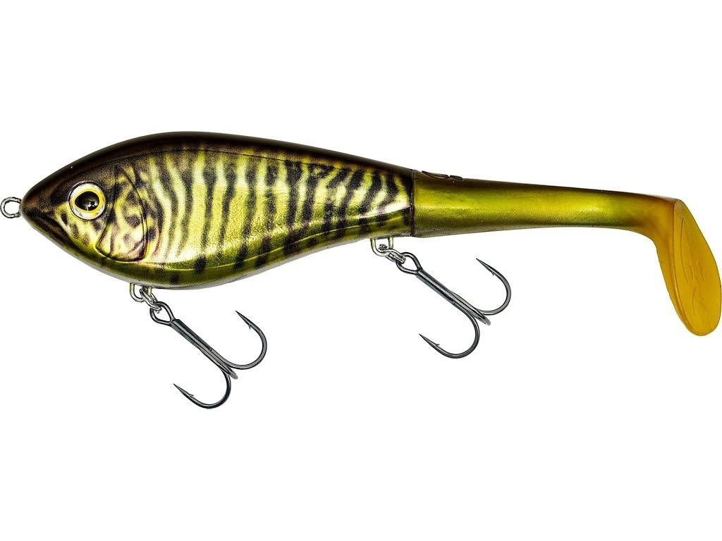 Gunnar de grondel R2F 8 cm 12 g / Pearl sand Bassbite 6 cm / Green tiger Jerkbite MR 9 cm / Purple tail Swim Tail 12 cm Suspending / Tiger musky Switch Weight Tungsten 3,5 g